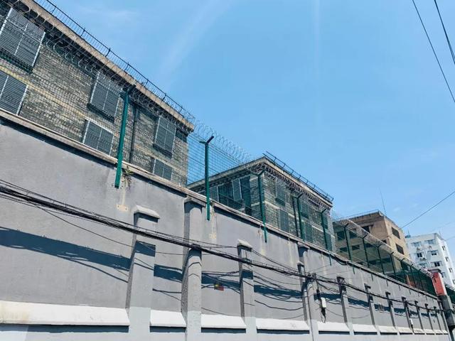 而后,转过一街角就能从高高的围墙外看到卫戍森严的提篮桥监狱。随着社会政权的更迭,这里曾经关押着一批又一批的政治犯,现在这里被用作于关押经济犯的场所。