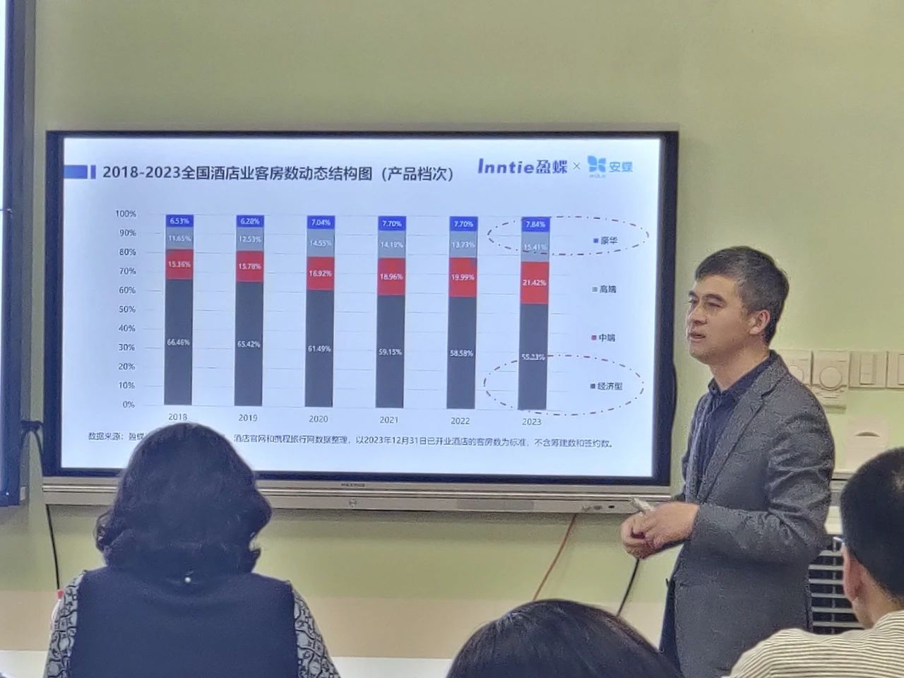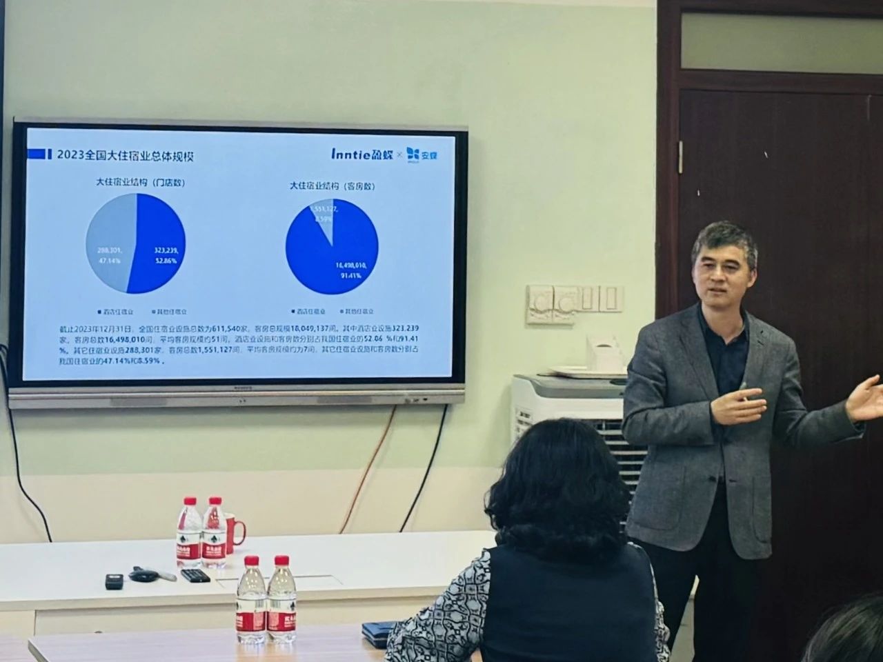 胡总先是通过PPT展示了国内酒店业2018-2023年的各项发展数据,并逐一对全国酒店门店数、客房数的趋势、酒店档次分类比例、酒店客房数量分布等具体数据进行了深度解析。