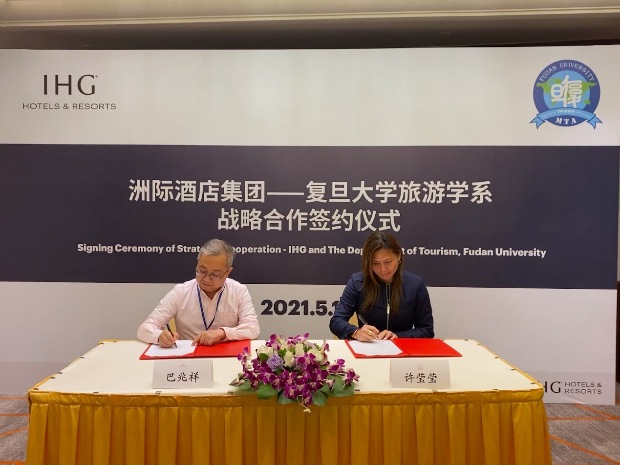 2021年5月19日下午,复旦大学旅游学系与洲际酒店集团战略合作签约仪式于上海复旦皇冠假日酒店光华厅举行。洲际酒店集团大中华区人力资源副总裁许莹莹女士、精英拓展及早期职业高级总监洪燕女士、企业传播总监赵盈伽女士、酒店开业及发展事业部首席人力资源总监郑芸女士以及校企关系及菁英职业负责人、雇主品牌经理邵啸川先生与我系巴兆祥教授、吴本副教授及MTA项目办公室的老师出席了本次签约仪式。